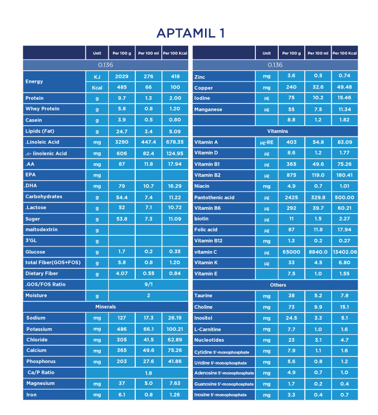 Vegetable oil blend (palm oil, low-erucic rapeseed oil, coconut oil, high-oleic sunflower oil, sunflower oil), demineralized whey powder, lactose, skimmed milk, galacto-oligosaccharides, whey protein concentrate, mineral blend, fructo-oligosaccharides, single cell oil, fish oil, calcium carbonate, trisodium citrate, potassium chloride, potassium hydroxide, vitamins, soy lecithin, choline chloride, nucleotides, L-carnitine, L-tryptophan.